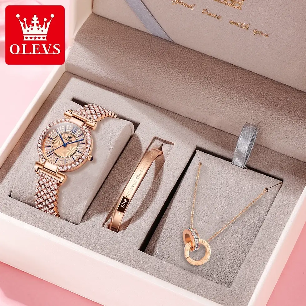 Original Ladies Olevs 9942 Diamond Watch Bracelet Necklace Set